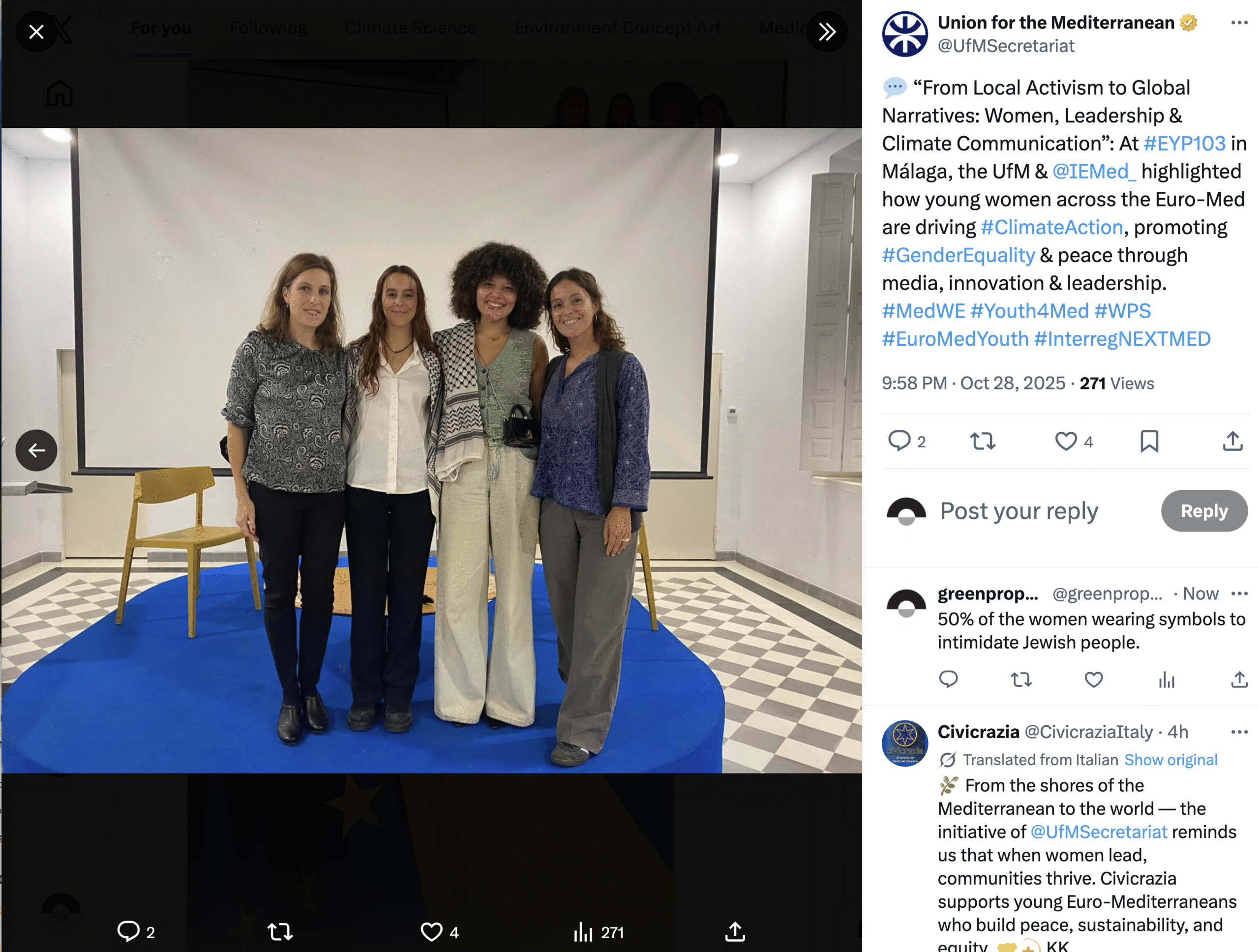 UfM officials regularly state that “women, youth, and climate” are the safest and most promising spaces for Euro-Mediterranean cooperation. Yet the institution’s own events tell a different story. Across the Women4Mediterranean, Women Innovators, Climate Adaptation, and Women Entrepreneurs conferences held in Barcelona, Cairo, and Brussels (2023–2024), not a single Israeli woman innovator or climate leader was featured on panels or in official delegations. They will publish data that will not include Israeli women.